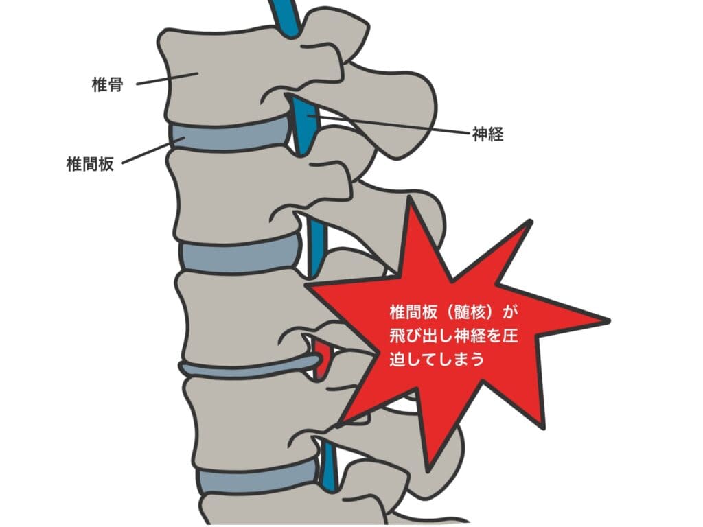 - 飛び出した髄核が、背骨の中を通る神経(脊髄や神経根)を圧迫する