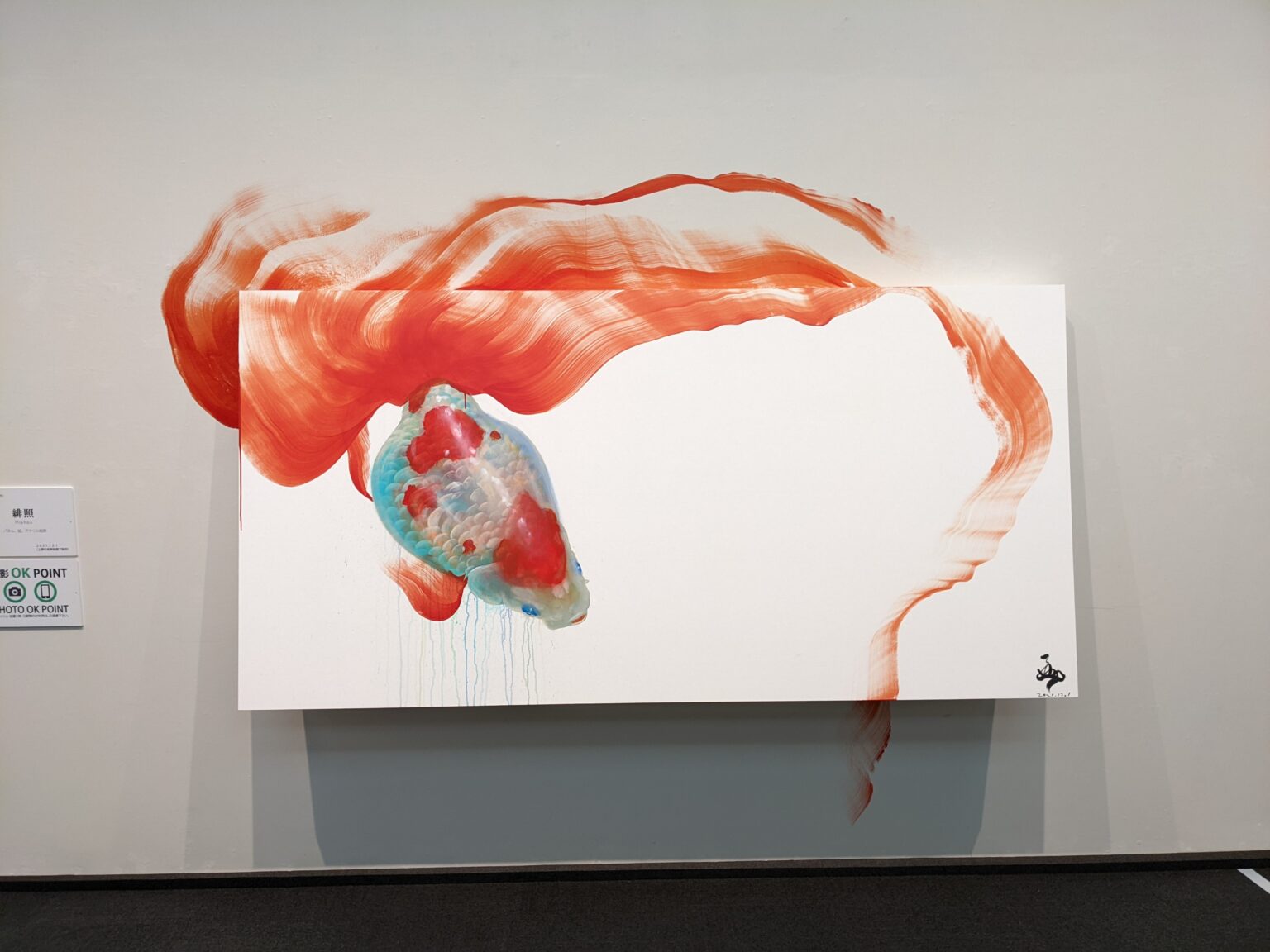 深堀さんの作品は、透明樹脂にアクリル絵具を重ねて描くという独自の技法で、まるで生きているかのような金魚が描かれています。写真撮影可能な作品も多く、その躍動感あふれる姿に圧倒されました。