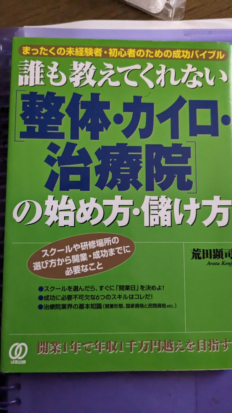 本日は「誰も教えてくれない「整体・カイロ・治療院」の始め方・儲け方―まったくの未経験者・初心者のための成功バイブル」を読み終えました。