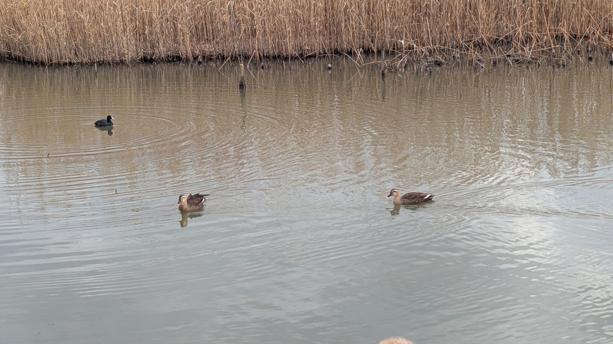 朝のハス池にはカルガモとアメリカオオバンがいました。