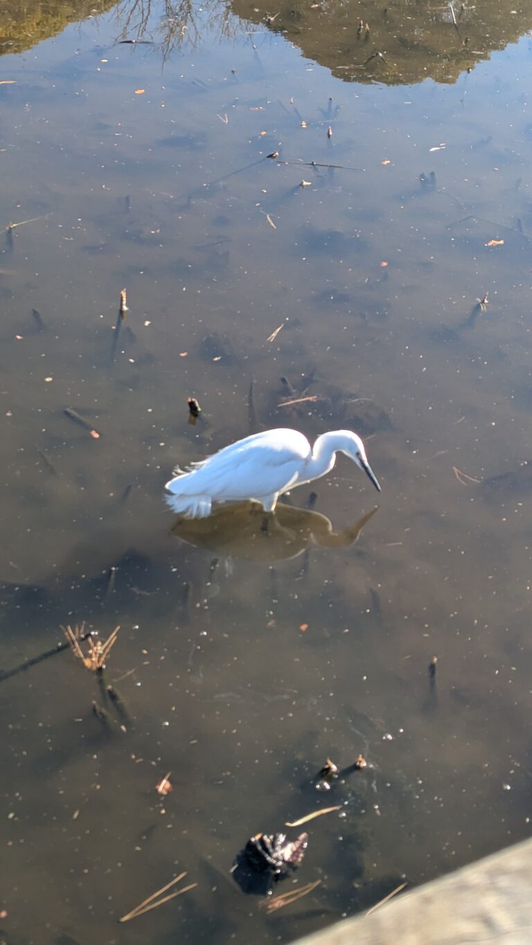 今朝のハス池にはカルガモ、アメリカオオバン、コサギ、カワセミがいました。