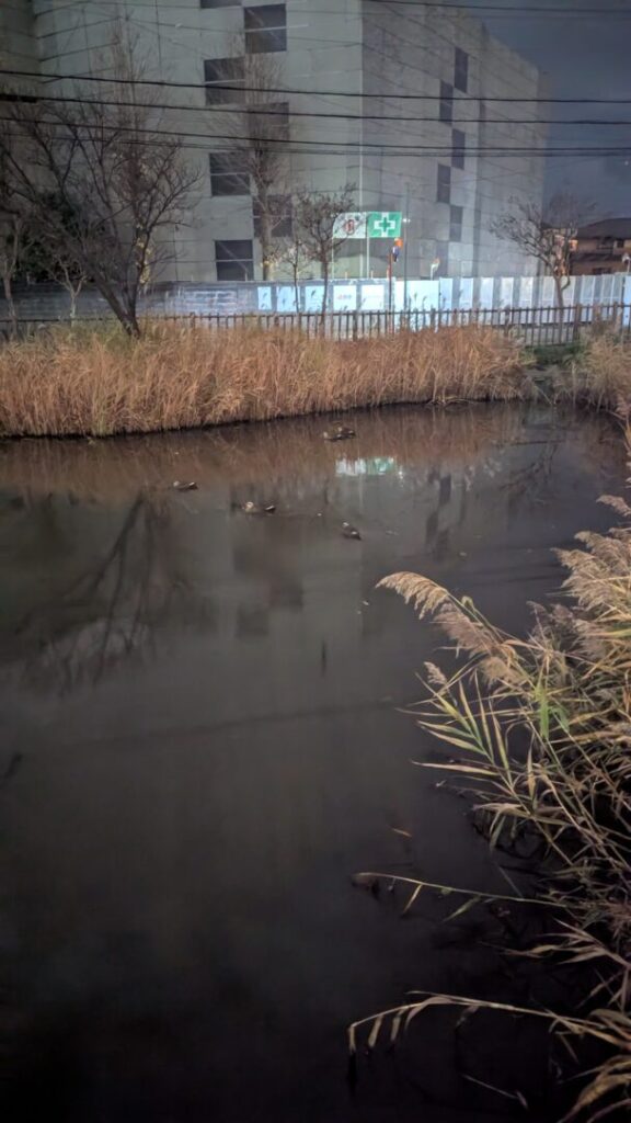 夜のハス池にはカルガモがたくさん集まっていて、これも珍しい光景でした。
