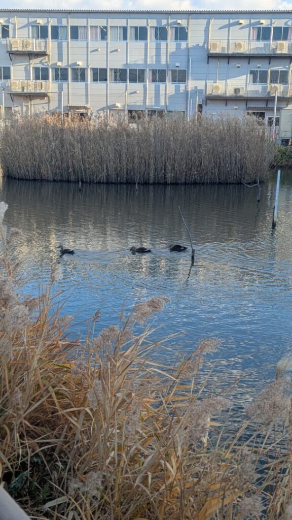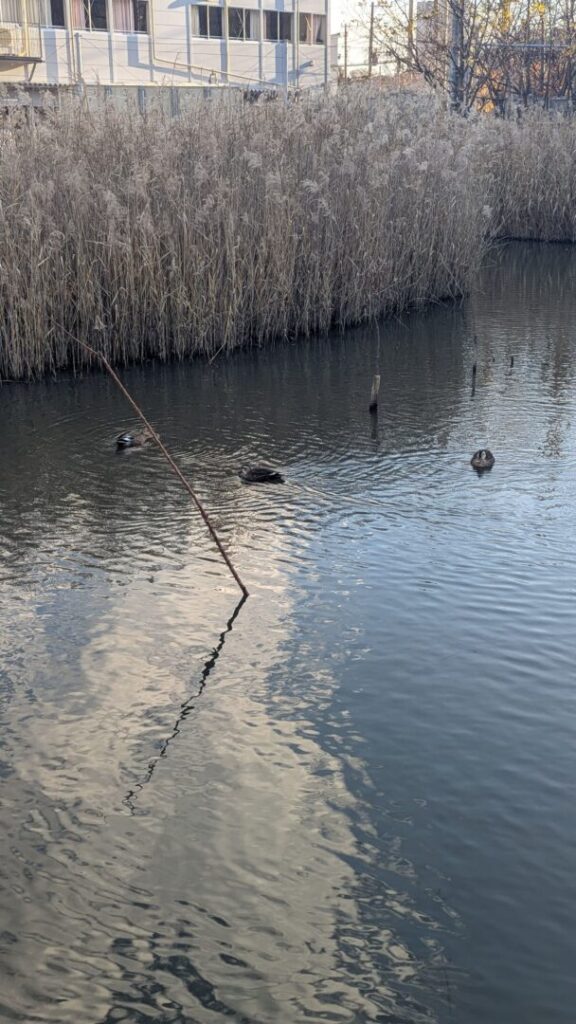 今朝のハス池ではカルガモを見かけました。