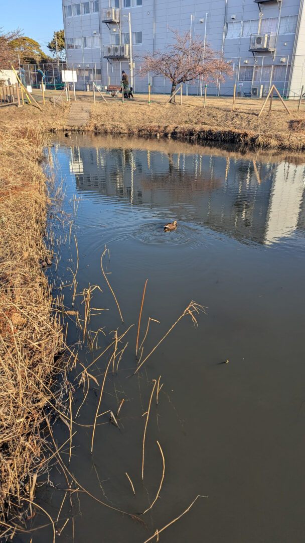 ハス池には今朝もカルガモがいました。