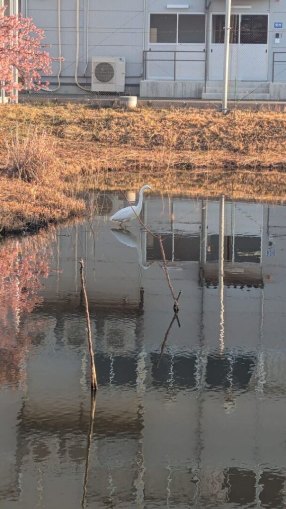 今朝のハス池には白鷺。